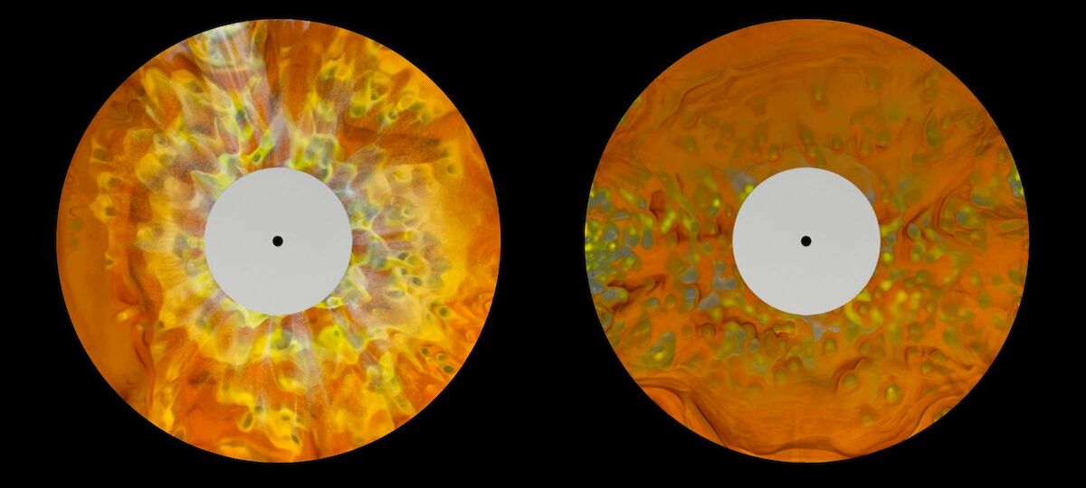 Any orbital radiance record can be combined with splatter in any size, amount or colour. This gives endless options and combinations. When using a galaxy effect with additional splatter, the effect can look very 3-dimensional.