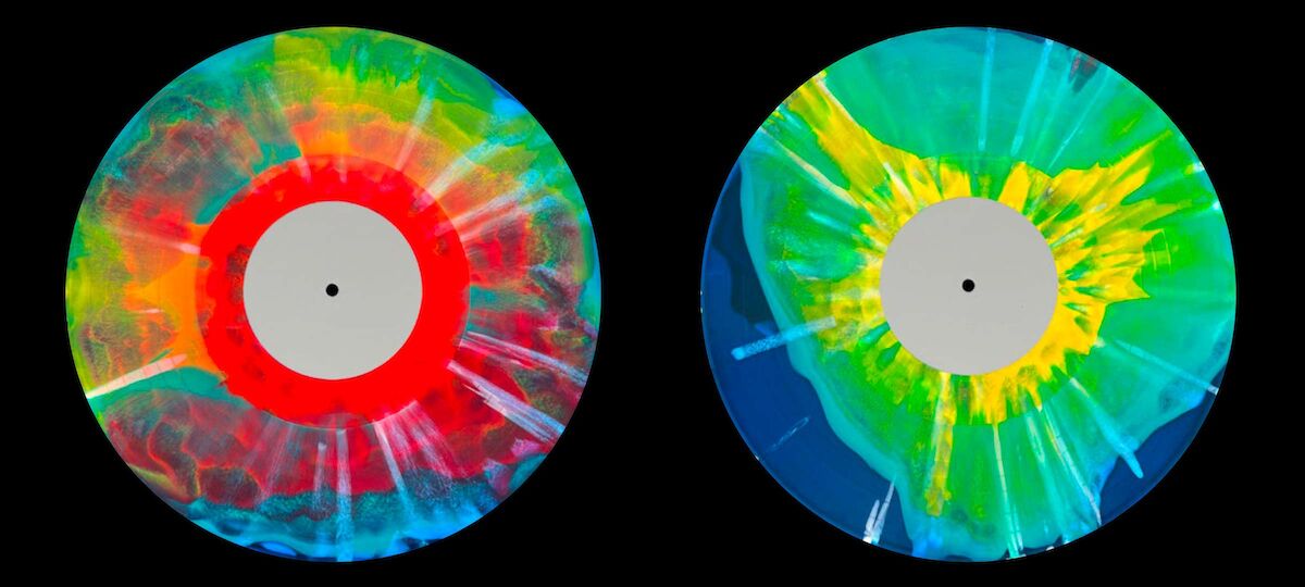 Coral is a multicolour record combining liquid splatter with the galaxy effect. The coral effect is strongest and looks closest to a coral when choosing a coloured transparent base or a semi solid base and a coloured transparent or semi-solid coral colour while the liquid splatter is a bright solid colour.